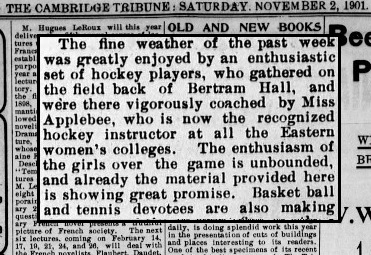 Soon after, she returned to Cambridge to coach at Radcliffe: “The fine weather of the past week was greatly enjoyed by an enthusiastic set of hockey players, who gathered on the field back of Bertram Hall, and were there vigorously coached by Miss Applebee, who is now the recognized hockey instructor at all the Eastern women’s colleges. The enthusiasm of the girls over the game is unbounded, and already the material provided here is showing great promise.”