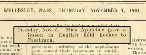 She then visited Wellesley again: “Tuesday, Nov. 5. Miss Applebee gave a lesson in English field hockey to Freshmen.”