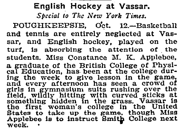 After that, according to the New York Times, she seems to have gone to Vassar: “Basketball and tennis are entirely neglected at Vassar, and English hockey, played on the turf, is absorbing the attention of the students. Miss Constance M. K. Applebee, a graduate of the British College of Physical Education, has been at the college during the week to give lesson in the game, and every afternoon has seen a crowd of girls in gymnasium suits rushing over the field, wildly hitting with curved sticks at something hidden in the grass. Vassar is the first woman’s college in the United States to take up the game, though Miss Applebee is to instruct Smith College next week.”