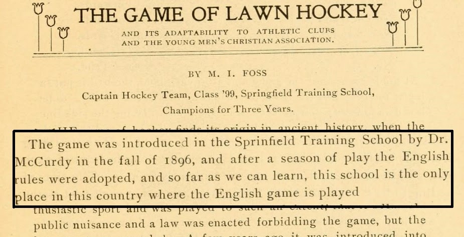 Further research seems to support the idea that the game could be found at Springfield even earlier. M. I. Foss, identified as the captain of the class of ’99 hockey team at the Springfield Training School, wrote in an entry for Spalding’s Athletic Library: “The game was introduced in the Springfield Training School by Dr. McCurdy in the fall of 1896, and after a season of play the English rules were adopted, and so far as we can learn, this school is the only place in this country where the English game is played.”