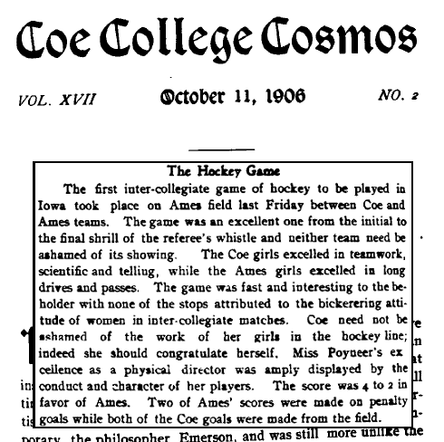 It didn’t take me too long since my last post to come up with a nominee for the first-ever intercollegiate field hockey game in the United States. The October 11, 1906 issue of the Coe College Cosmos contains an account of a game between the women’s field hockey teams of Coe College and Iowa State (referred to in the article as “Ames.”) The game is reported to have taken place on Friday, October 5, 1906 in Ames, with host Iowa State winning, 4-2.