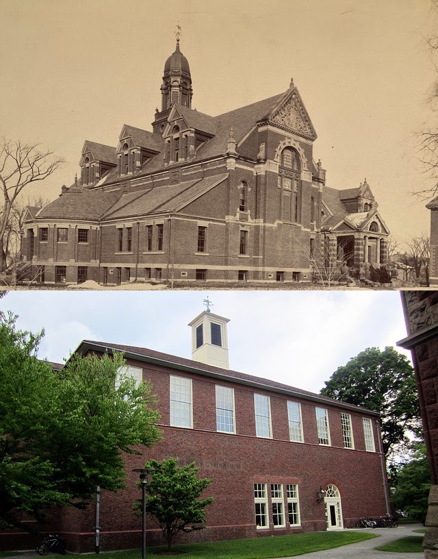 I was hoping that this was some kind of mistake, or that the building was simply renovated in 1940 rather than built then, so I went hunting for more information. But comparing a photograph of the Hemenway Gymnasium from the late 1800s to the one that stands today convinced me that these were, in fact, different buildings.