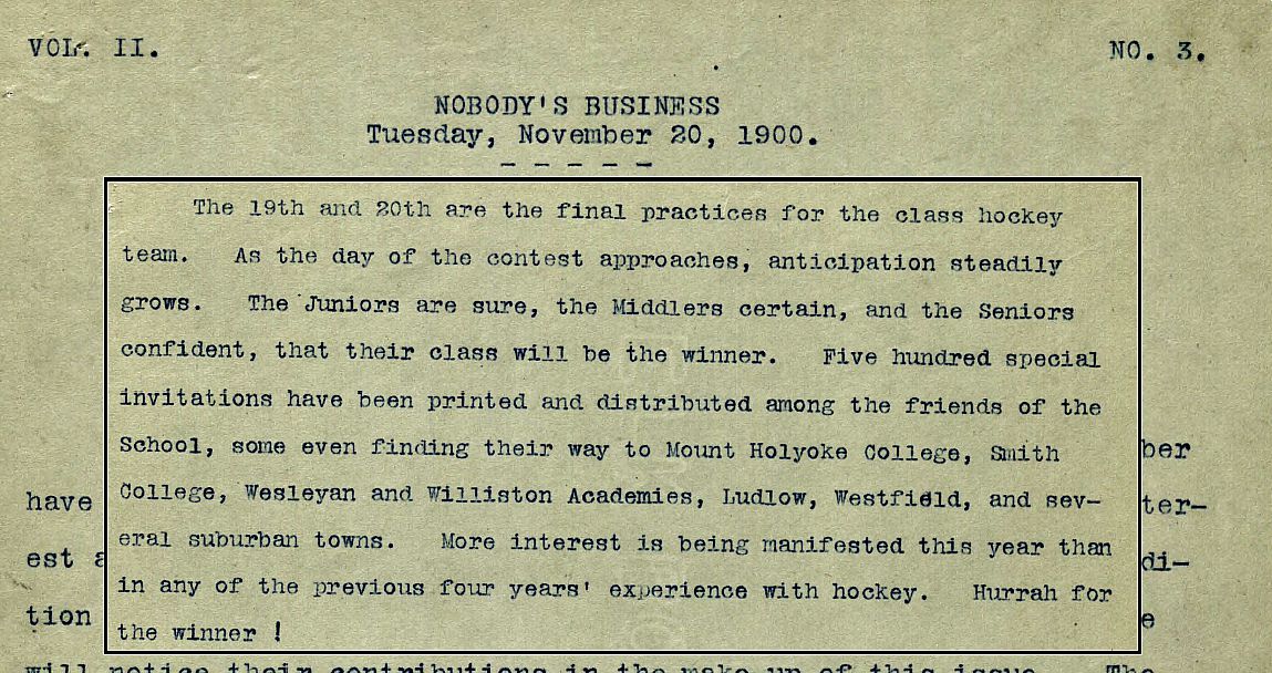 The November 20 issue of Nobody’s Business from that year reported that “five hundred special invitations have been printed and distributed among the friends of the school, some even finding their way to Mount Holyoke College, Smith College, Wesleyan and Williston Academies… More interest is being manifested this year than in any of the previous four years’ experience with hockey.”