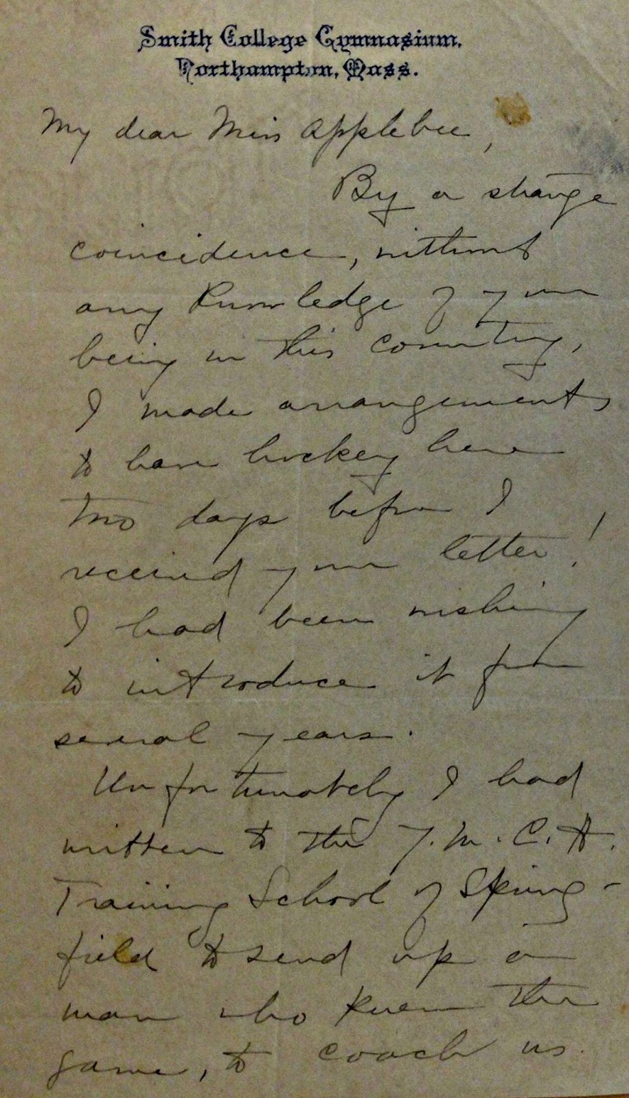 According to a letter she wrote to Applebee, Smith College athletic director Senda Berenson had written to the Training School in late September of 1901 in order to arrange for an instructor to coach her students in field hockey that fall. Two days later she received word of Applebee’s availability and hired her on instead.
